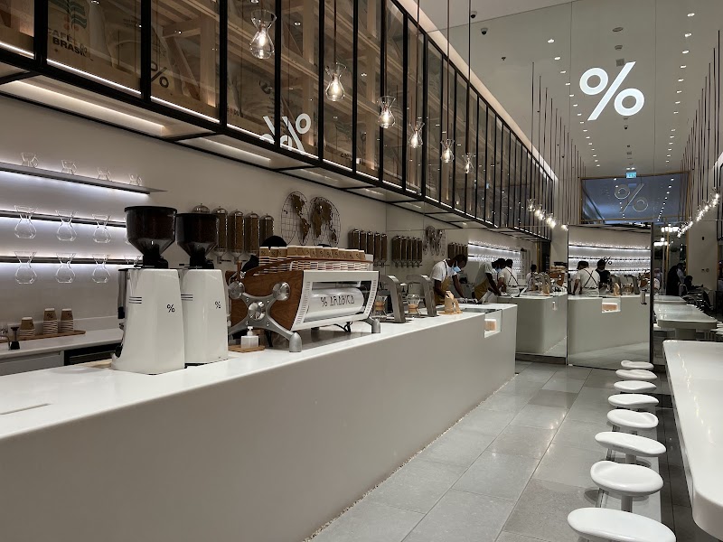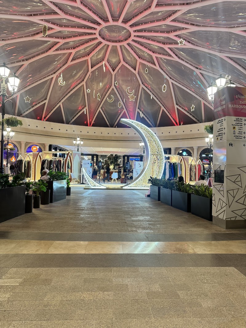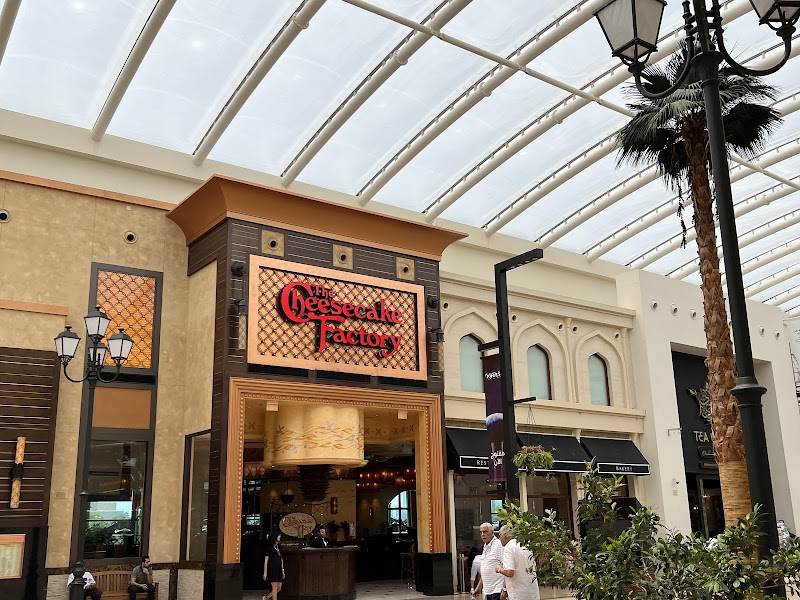 130 stores & eateries line this fancy, glass-topped shopping arcade with a city-street theme.